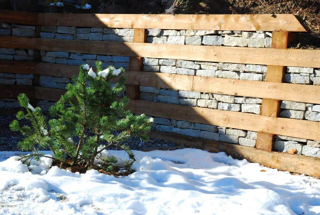 Réalisation des murs en traverses mélèze et mise en œuvre d’une parement en pierre sèche (barrettes de Luzerne)